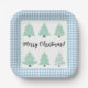 This adorable Christmas square paper plate features an assortment of whimsical, pastel Christmas trees on blue plaid background and says "Merry Christmas" (or personalize to a name or different phrase).