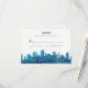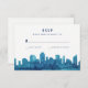 These modern styled rsvp cards feature a hand painted watercolor city skyline in navy blue and teal.