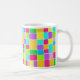 A mug with a colorful abstract digital watercolor design, made up of color rectangles each painted so that none of the colored rectangles touch, leaving a narrow strip of white paper. The painting was created using Artrage Studio Pro which gives a very fresh and realistic watercolor effect in beautiful vivid colors. The motif is repeated on both sides of the mug.