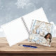 Winter theme journal notebook featuring a watercolor illustration of a cozy winter bedroom setting with pillows, ornaments, candles and books in various blue color tones with a young girl in a cozy winter sweater in the forefront holding an adorable golden retriever puppy. A watercolor illustration of a stack of books tied with blue ribbon and pinecone on reverse. Customizable journal name on cover.