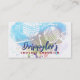 Watercolor style background with crochet hooks and balls of yarn on this business card for a crochet or yarn crafter.