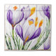 At the center of the tile, a vibrant crocus flower takes center stage. Delicately painted using soft and translucent watercolor strokes, the crocus blooms with gentle hues of lavender, lilac, and soft pinks. The petals seem to come to life, evoking a sense of movement and grace as if swaying gently in a spring breeze.