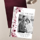 Announce your wedding date with our stylish and modern photo save the date card. The design features a border of painted watercolor crystals in shades of wine and burgundy. "Save the Date" is displayed in a black modern serif font. Personalize the unique save the date card by adding your photo, names, wedding date, and wedding location. The card reverses to display a beautiful burgundy watercolor background.