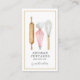 Watercolor cupcake bakery business card featuring a charming illustration of classic baking utensils including a whisk, rolling pin, and pastry piping bag arranged in a soft pink watercolor style. The warm handcrafted aesthetic reflects the creativity behind cupcake bakeries, cake studios, pastry chefs, and small dessert businesses. Elegant typography paired with the delicate watercolor artwork creates a professional yet welcoming look that suits bakers who meet customers at cake tastings, bakery counters, pop ups, dessert catering events, farmers markets, and specialty food shops.