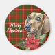 Watercolor illustration of brown Dachshund dog with poinsettia floral spray on festive green and red plaid background. "Merry Christmas " text can be changed to Personalize with name or other holiday message message