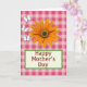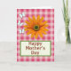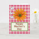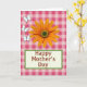 This card features a large daisy-like flower near the upper middle, with glowing orange petals radiating around a textured green center dusted with golden yellow, like a sunny bouquet offered with quiet affection ❤️. Three small white butterflies drift upward in the upper-left, their thin dark veining and tiny warm accents suggesting a gentle, companionable flutter through the air. Behind everything, a gingham background alternates soft and brighter pink squares with crisp white, bringing to mind a cozy tablecloth at a spring get-together shared with someone dear. Below the flower, a cream rectangular panel sits neatly across the lower portion, bordered by a fresh green frame that ties back to the flower’s center. Centered on that panel, the message “Happy Mother’s Day” appears in a classic serif style, colored warm earthy brown for an inviting, grounded look 🌼. The butterflies’ upward path and the flower’s open face create a tender sense of connection, like a glance exchanged between close friends. The overall palette balances orange, green, white, and pink, with the text panel standing out clearly against the patterned background. The pink-and-white gingham squares remain visible around the edges, especially above and to the sides of the cream message panel.