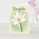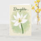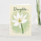 Designed with a soft watercolor look, this card centers on a white, many-petaled flower sitting in the lower middle of the front. A slim deep-green stem rises into the bloom, and the petals open gently as if leaning closer in a quiet, affectionate moment ❤️. In the flower’s center, pale green tones mingle with small touches of orange, drawing your eye like a warm spark against the white. The background fades from muted sage green into a creamy warm beige, like calm light settling over the scene. Near the top, the text “Daughter...” appears in dark green, written in flowing letters and spaced with plenty of air around it. Subtle shading along the petals and soft color transitions give the flower a tender, intimate feel without any harsh edges 🌼. The lower-middle bloom shows soft green at its core with tiny orange strokes, framed by pure white petals against the sage-to-beige wash.