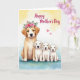 This design shows a gentle scene of a light-brown adult dog with white markings on her face, standing calmly as three pale-furred puppies press close at her side with trusting, wide-eyed looks ❤️. A ring of pink roses and leafy greens rests on her head, adding a soft celebratory touch that feels like a caring embrace. The puppies’ bodies lean toward her, and their small faces angle outward as if proudly sharing her attention with the viewer. Behind them, a warm yellow watercolor wash glows like sunlight and fades down into a quiet blue-green near the bottom. Near the top, two small pink hearts float in the open space, reinforcing the tender bond without needing extra decoration 🌼. The main greeting sits above the dogs in flowing, cursive-style lettering, colored in a deep pink that matches the roses. Smaller text is placed lower on the card in a lighter tone, leaving plenty of breathing room around the family. The floral crown shows layered petals in several pink shades with green leaves tucked between them.