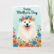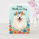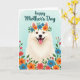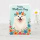 This card features a fluffy white dog centered in the frame, facing forward with a wide smile and a pink tongue that gives it a friendly, affectionate look ❤️. Its warm brown eyes seem to meet yours in a gentle, companionable way, like a loyal friend leaning in for attention. A flower crown rests on its head, mixing bright blue and orange blossoms with small green leaves that soften the scene with a caring, nurturing touch. Around the lower edge and along the sides, a border of red, orange, and blue flowers weaves through leafy greenery, creating a cozy garden setting that feels like it’s gathered especially for a loved one 🌼. The background is a light aqua wash with a watercolor feel, keeping everything calm and airy behind the detailed fur and petals. Near the top, the words “happy Mother’s Day” appear in teal lettering, placed above the dog’s head so the message is easy to spot. The teal text sits against the pale aqua background, while the floral border rises from the bottom corners with clusters of blossoms and leaves.