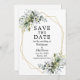Modern Elegant Watercolor Botanical Greenery Save The Date Card includes eucalyptus leaves, green botanical foliage, dusty blue leaves and other beautiful botanical greenery. Gold Geometric Frame.
