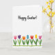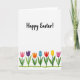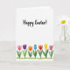 This greeting card features a bright white background with “Happy Easter!” placed across the upper area in dark, brush-like lettering that feels friendly and close. Plenty of open space around the words keeps the message easy to notice without crowding the design. Along the lower third, a neat row of seven watercolor-style flowers stands like a small garden shared between friends, side by side. Their petals show soft, watery edges and gentle color shifts that suggest a tender, thoughtful touch rather than a stiff pattern. The blossoms appear in soft pink, deep purple, orange, light blue, red, yellow, and magenta, creating a cheerful spring mix 🌷. Thin green stems rise from a single green line that runs horizontally, like a simple garden border. The overall layout feels balanced, with the text above and the floral band below, leaving the center airy and calm. Each flower has rounded petals with slightly uneven edges, and the green baseline stretches straight across the bottom beneath them 🐰.