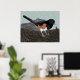Poster print with my original mixed media image of an Eastern Towhee scratching on the ground among fallen fir needles and twigs. The watercolor bird is mostly black with a white breast and rust-colored sides. Behind it is a large stone against a pale green grassy background.
