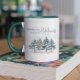 This design features an elegant Christmas mug, with a watercolor forest scene a traditional trendy, elegant calligraphy script design, with a seasonal winter, woodland greenery scene, perfect for festive coffee lovers gift idea, a traditional illustration, simple minimalist, pine tree drawing.
