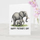 This card shows an adult elephant in gentle gray tones standing close beside a much smaller calf, their bodies angled toward each other as if sharing a quiet, affectionate moment ❤️. The larger elephant’s curved tusks and calm dark eye suggest steady care, while the baby tilts its head up with a trusting look and a small trunk softly curled. A plain white background keeps the focus on their closeness, making the space around them feel calm and open. Along the bottom edge, a light wash of green grass adds a simple outdoor touch without pulling attention away from the pair 🌼. Centered beneath the illustration, the message “HAPPY MOTHER’S DAY” appears in thick, friendly uppercase letters. The text is set in a dark tone for easy reading, with generous spacing that gives the design room to breathe. Subtle shading and fine skin folds add depth, making both elephants look softly rounded and real. The green grass sits like a narrow watercolor band under their feet, fading gently at the edges.