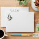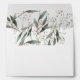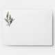 Watercolor green eucalyptus gum leaf on a customized printed return address envelope.