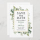 Modern Elegant Watercolor Botanical Greenery Save The Date Card includes eucalyptus leaves and botanical greenery foliage on a gold frame.
