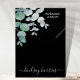 This unique jewelry display card is decorated with watercolor eucalyptus leaves on a black background.