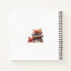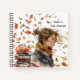 Fall theme journal / notebook featuring a watercolor illustration of a young girl with flowing wind swept hair and a stack of books swept up in a swirl of fall leaves in autumn colors.. The stack of books with fall leaves illustrations is repeated on the reverse. Customizable heading and journal name on cover. Spiral cord shown in black, additional spiral cords colors and inside paper designs available.