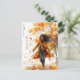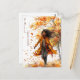 Postcard featuring a watercolor illustration of trees with falling leaves in vibrant, rustic orange, yellow and red hues. A woman in casual fall apparel walking in the foreground swept up in the autumn wind and a swirl of falling leaves. The script Fall Mood to the left of the images in a color to match the illustration.