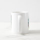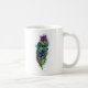 a colorful peacock feather tattoo design in ink and watercolors on a coffee mug
