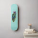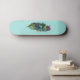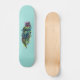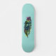 a traditional watercolor and ink design of an abstract peachock feather tattoo on a skateboard