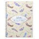 A pattern made up of watercolor feathers with varying stripes, spots and plain designs with colors in blue, pink, orange and brown colors. Branches and twigs with leaves and pussy willow buds also decorate the design. The background is a solid cream color. Easily personalize with your name and notebook subject title (or any other customized text you want really) inside a fancy oval frame with a gold gradient border and a white center.