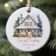 This beautiful ceramic ornament commemorates the "Our First Christmas in Our New Home" moment of your lifes. Featuring a charming illustration of a cozy snow-covered house adorned with festive holiday decorations, it is the perfect keepsake to celebrate a major milestone. Personalize your holiday decor with this elegant, timeless ornament, and cherish the memory of your first Christmas in your new space for years to come.