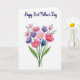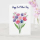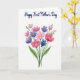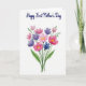 Designed with a soft watercolor look, this card features a loosely painted bouquet on a bright white background, with flowers that seem to lean toward each other like close friends sharing a quiet moment ❤️. Petals in gentle pinks, fuchsia tones, lavender, deep purple, and touches of rich blue gather in a relaxed cluster, each bloom marked with a sunny yellow center. Slender green stems rise from the bottom with a few simple leaves, giving the arrangement an airy, fresh feel. Above the flowers, the message “Happy First Mother’s Day” sits centered near the top in deep blue lettering, standing out clearly against the white space. The paint appears slightly transparent in places, with visible brush marks that add a tender, intimate texture. The open background leaves plenty of breathing room, letting the colors and message feel calm and affectionate 🌼. Several blossoms overlap gently, and a few petals fade softly at the edges where the watercolor thins. The bouquet spreads widest across the lower half of the front, with the tallest stems reaching up toward the text.