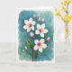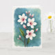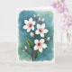 This design shows a flowering branch centered on the card, stretching diagonally upward as if reaching toward someone dear ❤️. Several four-petaled blossoms open along the stem, their white petals washed with a pale pink tint that grows deeper near the middle, like a gentle blush. Tiny stamen cluster in each bloom, dotted with small orange-yellow tips that sparkle against the soft petals. Tucked between the open flowers are many oval buds wrapped in rosy pink, closed tight as if saving a sweet moment for later. A few simple green leaves sit near the stem, adding a calm contrast and a quiet, companionable balance 🌼. The background is a loose watercolor wash of teal and aqua that softly bleeds and fades, giving the scene a tender, airy feel. Any greeting text would sit neatly near the top in a light gray tone, with a smaller line near the bottom in muted pink. A crisp white border frames the flowing teal-and-aqua background around the branch.