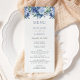 A beautiful wedding menu featuring a floral top border of watercolor flowers in shades of blue. The word "Menu" and the names of the bride and groom appear in dusty blue serif font, with the menu in charcoal gray. The back of the card is a matching shade of dusty blue.