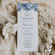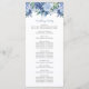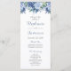 A beautiful wedding program featuring a floral top border of watercolor flowers in shades of blue. The names of the bride and groom and the subheadings appear in elegant dusty blue decorative script.