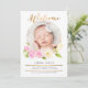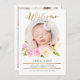 This stylish and elegant 2-sided photo birth announcement card features four (4) photos (front & back) of your newborn baby girl, custom text that can be personalized, watercolor floral wreath of camellia and magnolia, and faux gold embellishments. Customize this template product by adding your newborn baby's name, birth record, and the parents' names.