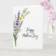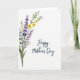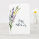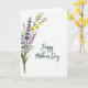 This greeting card features a soft watercolor-style floral arrangement gathered in the lower-left corner of a bright white background. Slender green stems and feathery leaves lift the bouquet diagonally, as lavender and deep purple blossoms mingle closely with sunny yellow daisy-like flowers, like friends leaning in for a photo ❤️. The loose paint edges and gentle pigment bleeds give each petal an airy, just-brushed look, with purples shifting from inky indigo to pale violet. The open white space around the flowers keeps the scene light and calm, letting the colors breathe without feeling crowded. On the right side, the words “Happy Mother’s Day” appear in a flowing, cursive-style lettering, set in a deep teal color that echoes the cool tones in the bouquet. The text sits roughly centered vertically, balanced against the diagonal rise of the stems, as if the message is quietly meeting the flowers halfway 🌼. The composition ends with the bouquet anchored low-left and the teal greeting on the right, surrounded by wide white margins.