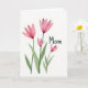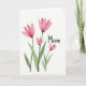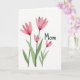 This card features a soft watercolor-style bouquet of abstract flowers on a bright white background, arranged like a gentle gift offered with care ❤️. Several stylized blossoms in light pink rise on thin green stems from the lower left, leaning slightly toward the open space as if reaching out. The petals shift from coral at the tips to deeper rose near the base, giving the blooms a tender, romantic glow without looking heavy. Long, tapering green leaves weave alongside the stems, with small changes in green tones that add a natural, living feel. On the right side, the word “Mom” appears in simple, flowing dark green lettering, set apart so it reads clearly against the white. The roomy background keeps the layout airy, like a quiet moment shared between close family or friends 🌼. The flowers cluster to the left while the dark green “Mom” sits to the right, leaving a wide white margin around both.