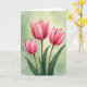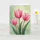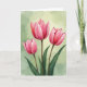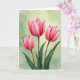 This design shows three tall watercolor-style flowers rising together like close friends leaning in, their petals opening with a tender, shared energy ❤️. The blossoms run from deep fuchsia near the centers to a soft blush at the edges, with gently ruffled contours that feel delicate and intimate. The middle flower stands a bit higher, while the two beside it tilt slightly as if keeping one another company. Thin earthy-brown stems and wide green leaves gather near the bottom, grounding the scene with a natural, calm balance. Behind them, a muted sage-green wash fades lighter in places, like spring light drifting through a quiet room. Fine lines and soft shading in the petals add texture that suggests a velvety touch and a slow, affectionate pause. A short greeting sits near the top in small, light-colored lettering, with a second line centered below it in a slightly darker tone 🌼. The background shows gentle, cloudy gradients of sage and pale green with a few brighter, misty patches.
