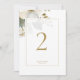 Chic and elegant. This gorgeous wedding table number features a lovely watercolor floral bouquet with imitation gold accents. The design includes a contemporary font in imitation gold set inside a soft white overlay with delicate frame. The design is repeated at the back.