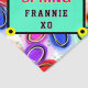 Happy Spring Name XO typography in pink and black against mint green geometric background with black rectangle and yellow circle corners. Watercolor flowers background in red pink, purple, green, blue, orange. Original Artwork by TamiraZDesigns.