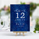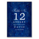 Watercolor Galaxy Cosmic Stars Starry Table Number. This design features twinkling star lights in space against a nebula starry sky of a celestial navy blue universe. Personalize this custom design with your own text and event details.