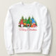 Merry Christmas Colorful Fun Watercolor Gnomes with Christmas Presents Holiday Sweatshirt with Pine Trees and String Lights.