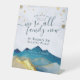 Modern Vintage Elegant Open Seating Wedding Pedestal Sign Template - Blue Green and Faux Gold Foil Watercolor Mountains Landscapes Scenery.