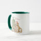 Christmas holiday mug featuring a watercolor illustration of two golden retriever puppies dressed for the holidays in santa hats sitting in front of a Christmas trees adorned with lights and ornaments. A Merry Christmas greeting in the upper right in a color to match illustrations. Additional styles and rim and handle colors available.