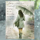 Spring inspired postcard featuring a watercolor illustration of a woman walking down a paved path on a rainy day. She is seen from behind, wearing a light-colored coat, knee-high boots, and carrying a bag over her shoulder. She holds an umbrella above her head, shielding herself from the rain. The background is misty and blurred, with greenery and stone walls visible along the path.