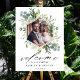 This wedding welcome sign (poster) features painted watercolor eucalyptus, green leaves, and a photo with a faux gold hexagon frame. For more advanced customization of this design, please click the "Customize further" link. Matching items are also available.
