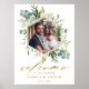This wedding welcome sign (poster) features painted watercolor eucalyptus, green leaves, and a photo with a faux gold hexagon frame. For more advanced customization of this design, please click the "Customize further" link. Matching items are also available.
