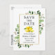 Modern Watercolor Eucalyptus Greenery Lemons Gold Frame Save The Date Engagement Announcement Postcard