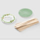 Green and white wedding favor fans featuring ferns, wildflowers and strawberries and a sage green watercolor wash background.