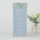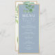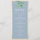 Simple, elegant, botanical dusty blue wedding menu, with watercolor eucalyptus greenery and modern calligraphy script.
