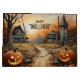 Halloween gift bag featuring a watercolor image of a haunted farmhouse on an eerie autumn evening with bats flying about and lit pumpkins to greet you in the foreground. Happy Halloween greeting in a spooky font near the top center of sign. Additional sizes available. Image may need to be adjusted for varying sizes.