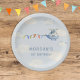 Celebrate your little boy's first birthday with this cute air travel-themed party paper plates, featuring a wolf flying an helicopter with colourful buntings and soft watercolor clouds. Personalize the text to suit your party details.