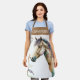 A beautiful watercolor painting of the head of a white horse with a gray mane that has soft blue and burnt orange wildlfowers with foliage around it set against a white background that has a brown top edge on which your name appears. These are ideal for horse lovers and anyone who is looking for unique gifts for their bridal party. Celebrate your country; western; Texas or rustic barn fall bbq or outdoor braai with these elegant aprons.